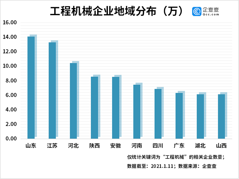 2020年,工程机械迎来行业顺周期。在“新基建”等东风的催动下,三一重工、中联重科、恒立液压等龙头企业业绩飘红。企查查数据显示,目前我国共有157.74万家工程机械相关企业,山东以14.11万家企业排名第一,江苏、河北分列二